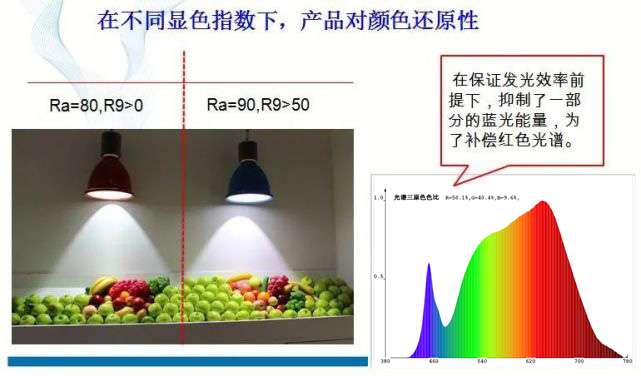 光源的显色指数是指在待测光源照射下的物体的颜色,与物体实际颜色相符合的程度,用Ra表示。颜色失真越少,显色指数就越高,光源的显色性越好。国际上规定参照光源的显色指数为100。